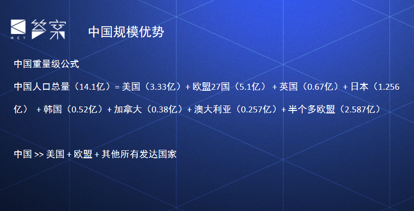 我們為什麼能夠做到這一點?原來很多人在説中國有規模的優勢,怎麼具體理解這個規模優勢?這一個公式大家能看明白就可以理解了。這個是中國的人口,相當於對應的市場規模,是美國加上所有其他發達國家的總和,還富裕出半個歐洲。這個就導致我們人才上面有非常多的優勢。今天下午在來這裏的路上,我和我們這一組的嘉賓在談一個問題,為什麼日本經常在科技上判斷出錯,而中國每一個技術都能抓住?是因為我們並不是判斷能力強,而是我們所有技術方向全在幹。因為我們有這樣的人才的優勢,有規模的優勢,所以我們每一個都可以做。只要有一個成,我們就肯定不會錯過方向,是吧?