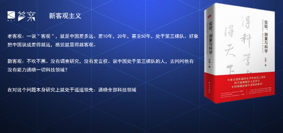 我在2023年倡導一個概念,叫“新客觀主義”,以這個來認識我們今天的世界。為什麼?過去一提到“客觀”,就是“我們要客觀地認識到中國的差距,我們還差多少年”。有的時候説差10年,還有説差20年,恨不得差50年。説我們是第三梯隊,恨不得説我們第五、第六梯隊,是吧?真正的客觀是什麼?我覺得網絡上有一個詞是比較好的,叫“不吹不黑”。毛澤東説沒有調查研究就沒有發言權,你説中國處於第三梯隊,你有沒有把中國所有科技領域都深入系統地研究過一遍。如果你沒做過,憑什麼去得出這個結論?我來説這個話,應該説還是有一點資格的,因為我所研究的學術內容叫“全科型”,就是把所有的科技領域全部研究完了,所以我是做過調查研究的。
