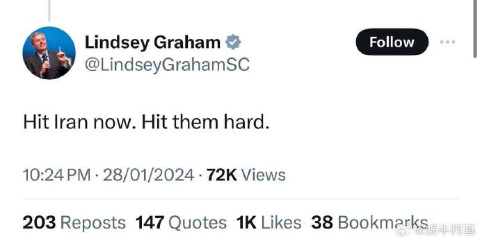 阿肯色州參議員湯姆·科頓(共和黨)針對美軍遇襲事件造成3名美軍死亡、25 人受傷發表聲明: