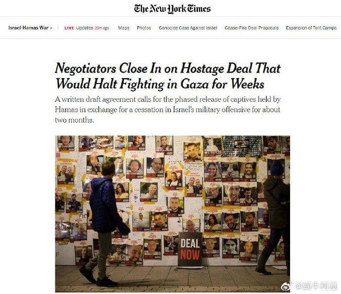 紐約時報援引消息人士的話稱,以色列和哈馬斯即將達成協議,釋放加沙地帶的人質_風聞
