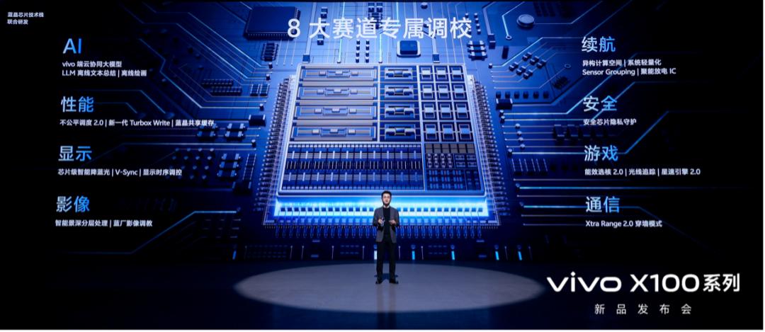 vivo X100系列的發佈會上,花了大篇幅介紹vivo自研技術品牌“藍科技”矩陣,瞄準了四大方向——芯片、續航、AI及操作系統。包括藍晶芯片技術棧、藍海續航系統、藍心大模型、藍河操作系統,基於用户導向打造創新系統,並聯合產業鏈實現了多項長賽道技術突破。