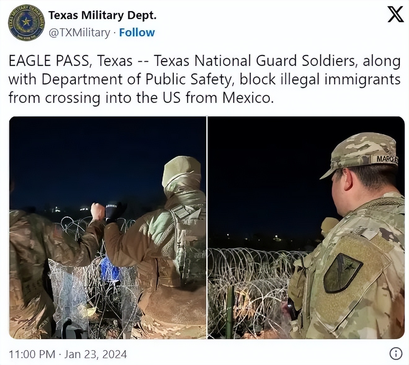 得州的州國民警衞隊開始在美墨邊境上拉起鐵絲網圍欄,並用武力手段阻止非法移民進入得州。