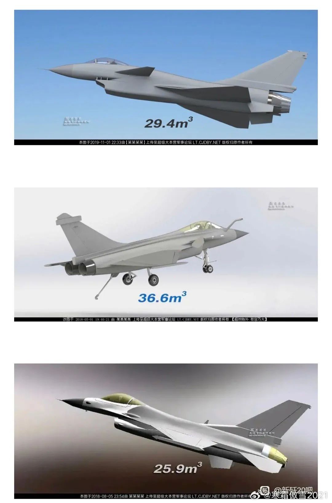 10C只是殼子看着長雷達罩大(圖2對比陣風雷達罩可見10的雷達IRST都比陣風颱風大一圈)所以外形上看着大,其實際毛體積29.4立方米左右比陣風颱風略小些,但大於F16的25.9立方米大於梟龍的24.1立方米(圖1),F16毛體積比三隻鴨子都小(梟龍雖小推力差)。