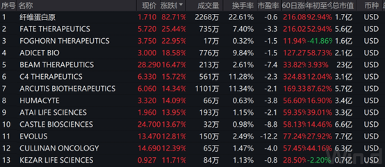 納斯達克生物科技指數(NBI)成分股方面,纖維蛋白原暴漲82.71%,FATE THERAPEUTICS、FOGHORN THERAPEUTICS漲超20%,ADICET BIO、BEAM THERAPEUTICS、HUMACYTE、ATAI LIFE SCIENCES漲幅居前。