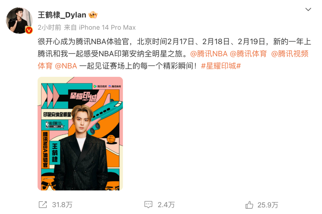 值得一提的是,在NBA全明星賽期間,**中國內地男演員王鶴棣將化身為騰訊NBA體驗官,**前往賽場全方位感受全明星賽的魅力,籃球與娛樂的結合打破了次元壁壘。
