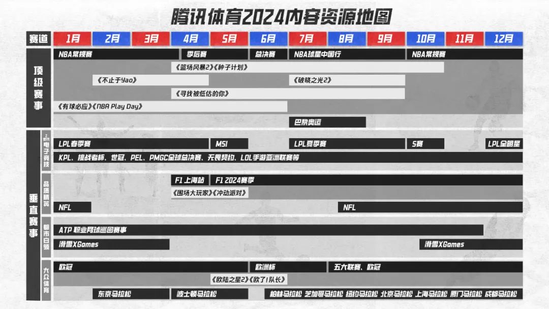 騰訊體育2024內容資源地圖而作為騰訊生態中體育內容的中央廚房,騰訊體育希望通過賽事版權、深度共創、體育經紀,為賽事方、品牌方、體育用户搭建全方位的「體域營銷」主場,讓各方訴求在這個場域持續迴響。