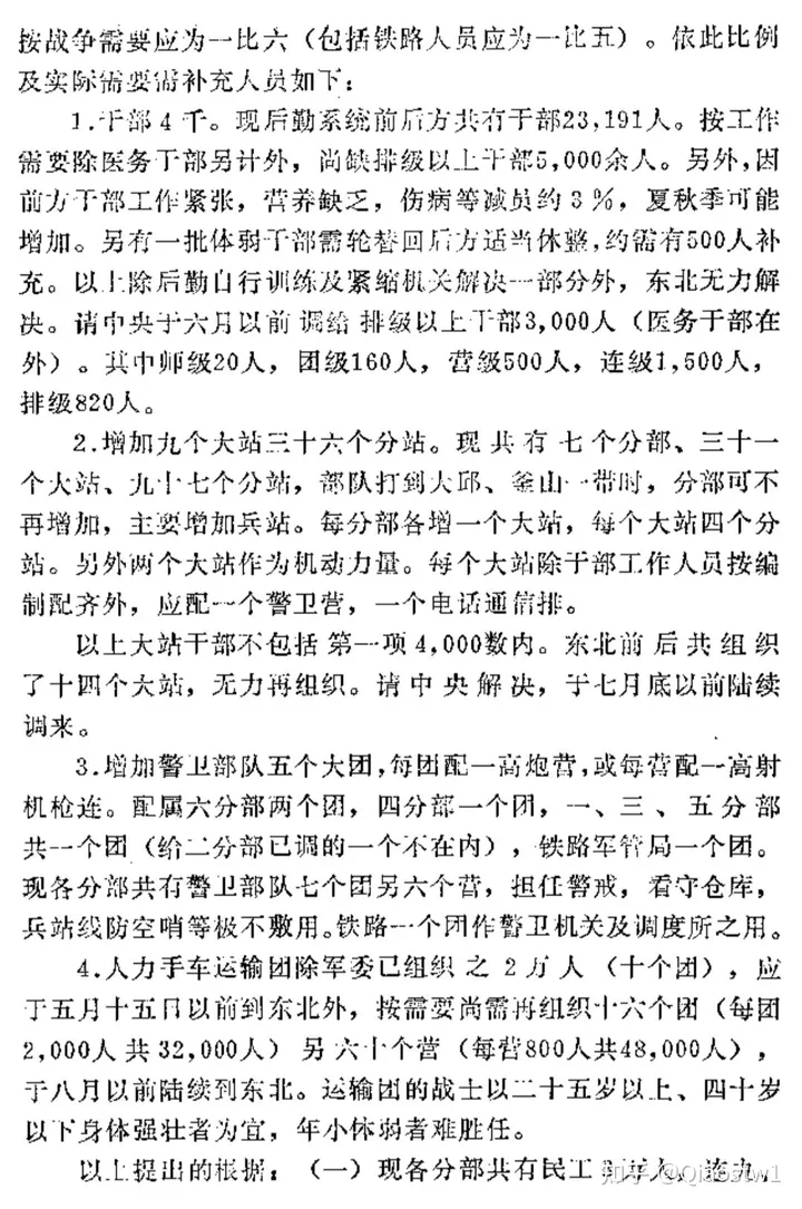 現後勤(包括鐵路軍管局,不包括在東北的後勤各部及後方醫院,以及鐵道兵團、鐵路工程隊、各兵團、各軍後勤人員)與部隊比例約為一比七(如包括鐵司及工程總隊則為一比五點八)。按戰爭需要應為一比六(包括鐵路人員應為一比五)。依此比例及實際需要需補充人員如下: