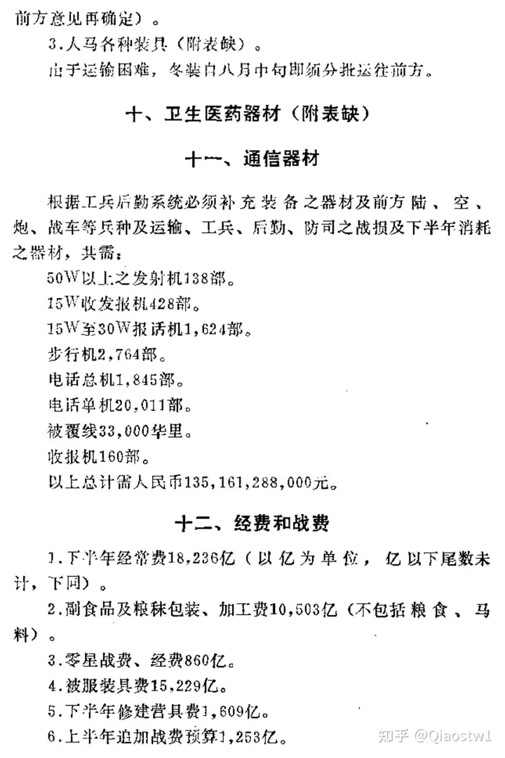 6.各種工具、器材包括前方炮兵觀測器材,工兵架橋渡河各種工具、器材及機械儀器等共需人民幣1,790億。為供應及時,均須於第二、三季準備完,並按需要及時發出。