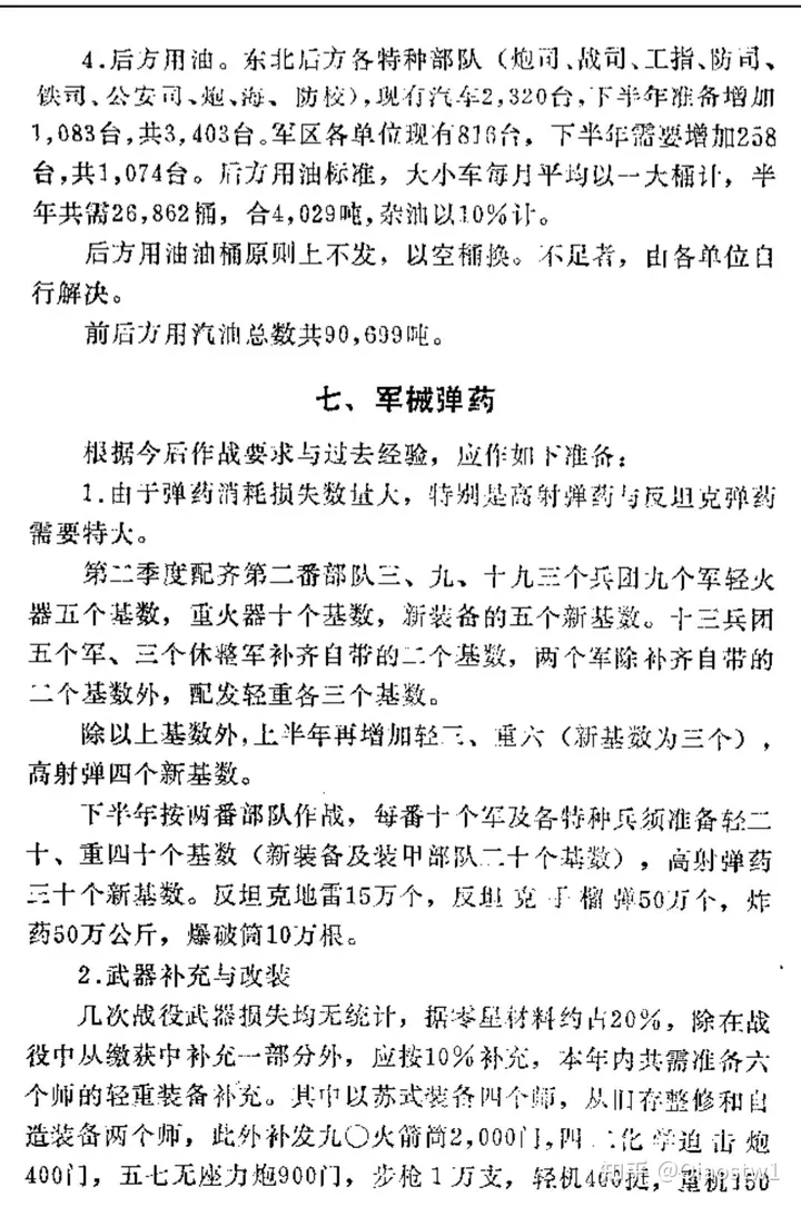 幾次戰役武器損失均無統計,據零星材料約佔20%,除在戰役中從繳獲中補充一部分外,應按10%補充,本年內共需準備六個師的輕重裝備補充。其中以蘇式裝備四個師,從舊存整修和自造裝備兩個師,此外補發九〇火箭筒2,000門,四二化學迫擊炮400門,五七無座力炮900門,步槍1萬支,輕機400挺,重機150挺,其他各種炮800門。另外從庫存與修理中補齊三個獨立師的裝備。