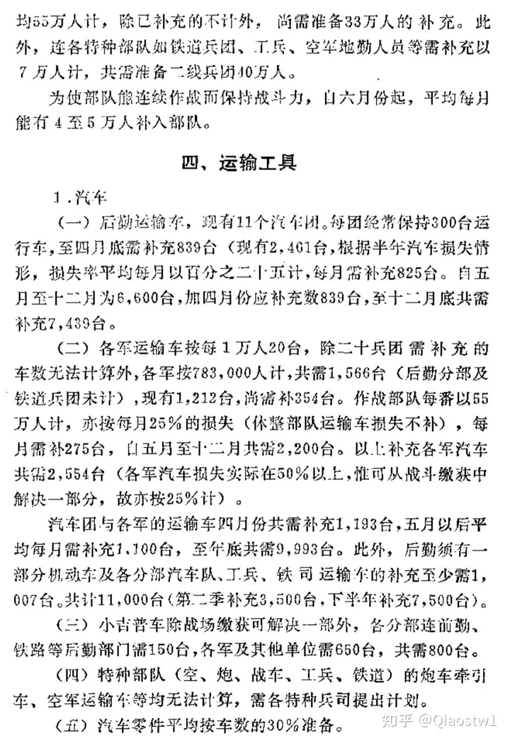 (二)各軍運輸車按每1萬人20台,除二十兵團需補充的車數無法計算外,各軍按783,000人計,共需1,566台(後勤分部及鐵道兵團未計),現有1,212台,尚需補354台。作戰部隊每番以55萬人計,亦按每月25%的損失(休整部隊運輸車損失不補),每月需補275台,自五月至十二月共需2,200台。以上補充各軍汽車共需2,554台(各軍汽車損失實際在50%以上,惟可從戰鬥繳獲中解決一部分,故亦按25%計)。