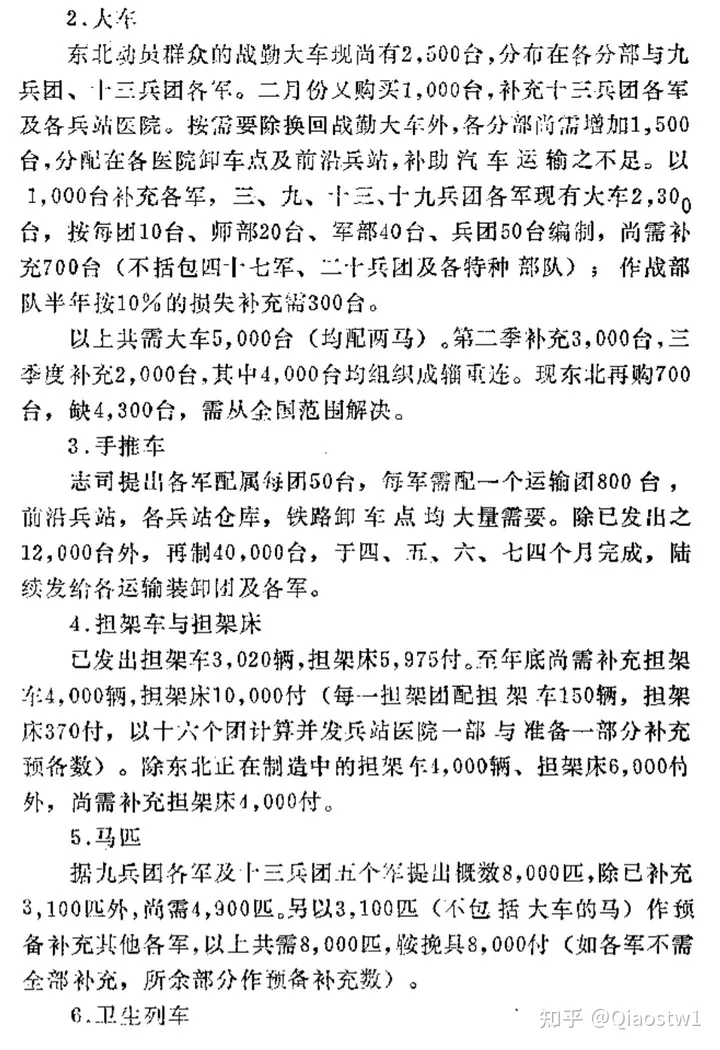 以上共需大車5,000台(均配兩馬)。第二季補充3,000台,三季度補充2,000台,其中4,000台均組織成輜重連。現東北再購700台,缺4,300台,需從全國範圍解決。