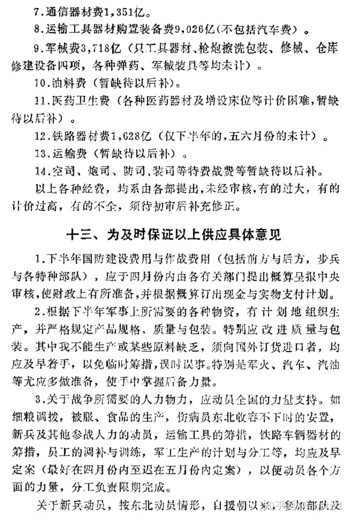 1.下半年國防建設費用與作戰費用(包括前方與後方,步兵與各特種部隊),應於四月份內由各有關部門提出概算呈報中央審核,使財政上有所準備,並根據概算訂出現金與實物支付計劃。