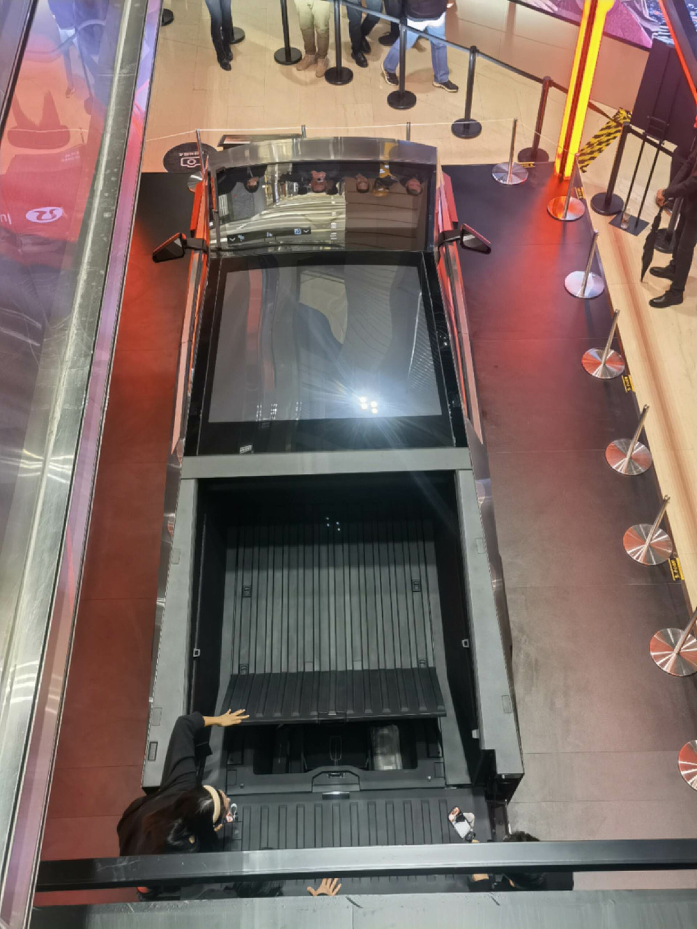 第一點就不用多説了,但這車是真大啊,車長5.68米,比理想最大的MEGA(5.35 米)還要長一截,車寬也達到了2.2米,要知道,國內一般標準停車位的寬度是2.5米,可以停得滿滿當當。Cybertruck的後鬥尺寸為長1.83米(約合6英尺),寬1.22米(約合4英尺),基本上是單人牀的大小,足夠在上面搭個帳篷再打一桌麻將。後鬥還能打開板子放東西,神似小户型房子的置物思路。除了尺寸大,這台“鋼鐵巨獸”的總體牽引能力也高達11000磅。