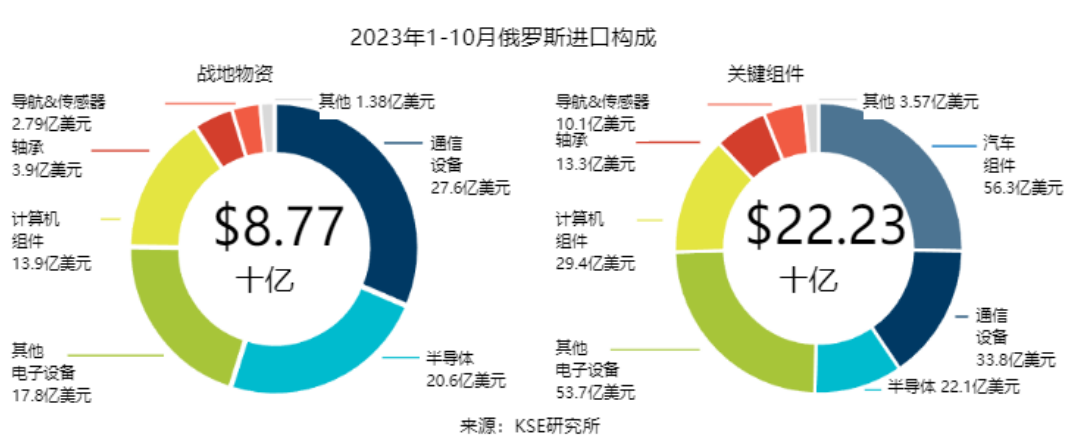國外零部件進口出現反彈**。**俄羅斯被制裁後(2022年3月至7月),對“戰場物資”(戰場物資:歐盟、美國、英國和其他聯盟國家已確定的45個[6位]海關HS碼清單;關鍵部件:報告自己的定義,不包括一些主要用於民用目的的戰場物資[例如智能手機],但報告認為需要更廣泛關注的其他產品,包括485個[10位]海關HS碼)與“關鍵部件”的進口出現了短暫的急劇下降,分別下降了45.5%和47.4%。但經過調整供應鏈,俄羅斯進口量有所恢復,2022年8月至12月較2022年3月至7月分別增長84.1%和42.8%。到2023年1月至10月,戰場物資進口接近制裁前的水平。