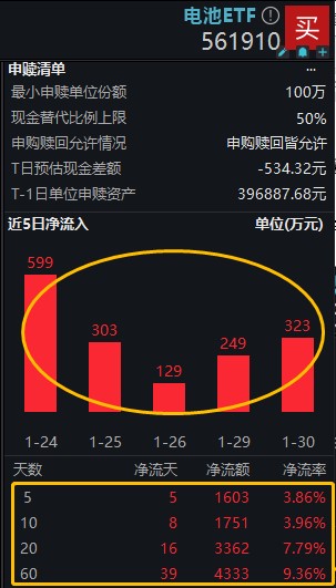 受益於上游資源品止跌企穩,鋰電板塊蠢蠢欲動搶跑頻現。近期資金借道電池ETF(561910)密集佈局提前埋伏。截至1月30日,該基金獲資金連續5日淨流入,單月份額擴容8.96%引領同類標的!