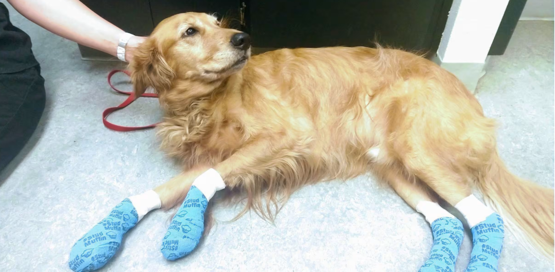 下雪天的融雪劑和夏天的燙柏油路面對狗爪子也會有影響。這隻金毛的jio被馬路燙傷,不得不被包起來。|參考資料12