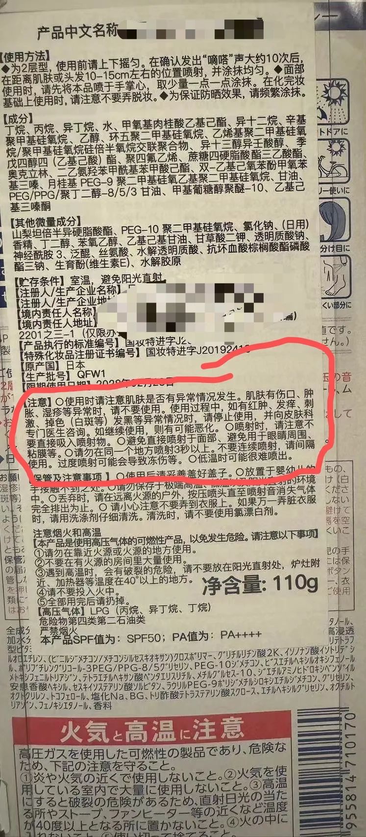 筆者也找到身邊朋友,拍了一張噴霧式防曬霜外包裝的信息介紹。筆者注意到,這款防曬霜確實有注意事項。其中指出,當皮膚有傷口、腫脹、濕疹等異常請勿使用;如使用後出現過敏症狀時應諮詢醫生;避免直接噴射於面部、避免用於眼睛周圍、黏膜等;請勿在同一個地方噴射3秒以上,過度噴射可能導致凍傷等。