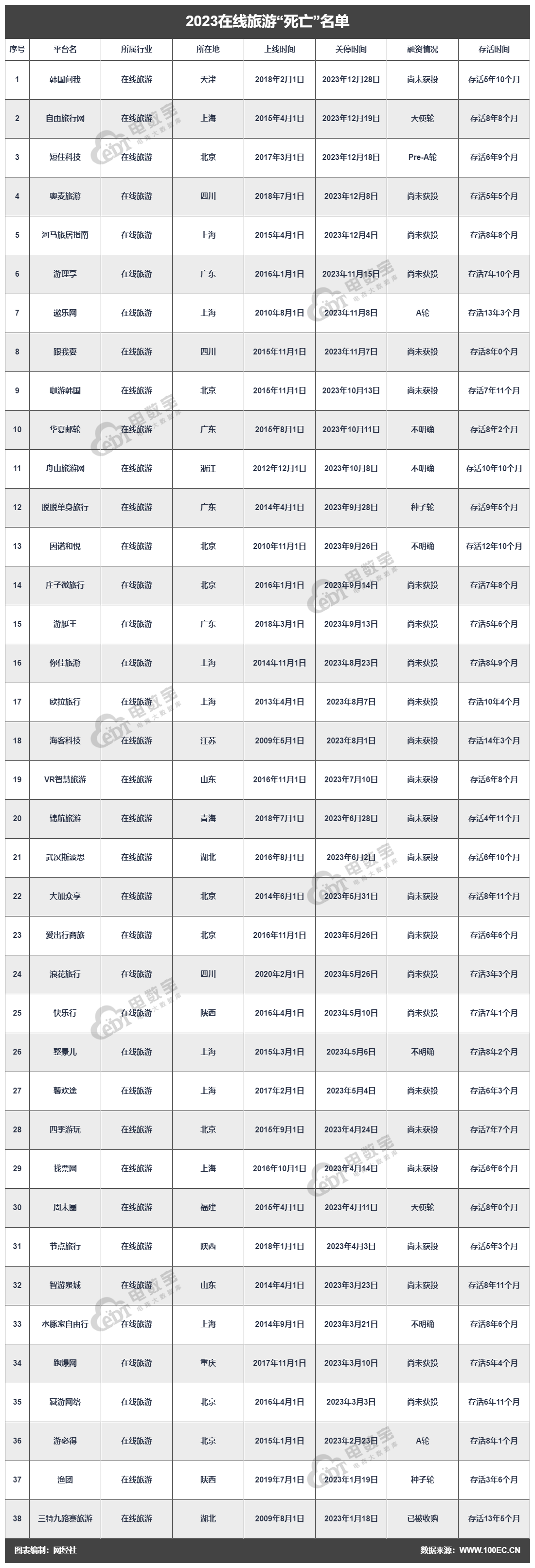 然而,隨着市場的持續發展,競爭也日趨激烈。一些在線旅遊平台由於經營不善或未能適應市場變化,逐漸走向了消亡。據“電數寶”電商大數據庫顯示,2020年-2023年四年期間,共有112家在線旅遊企業未能挺過疫情“寒冬”。