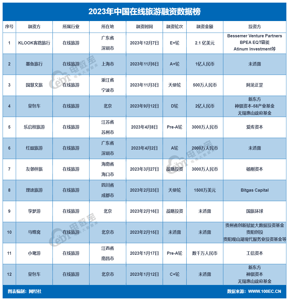 此外,據“電數寶”監測數據,2023年在線旅遊行業的融資活動也相當活躍。**全年在線旅遊融資事件數共12起,融資總金額達到19.4億元,同比增長65.46%。**這進一步印證了在線旅遊行業的復甦趨勢,同時也表明投資者對在線旅遊行業的未來發展抱有信心。