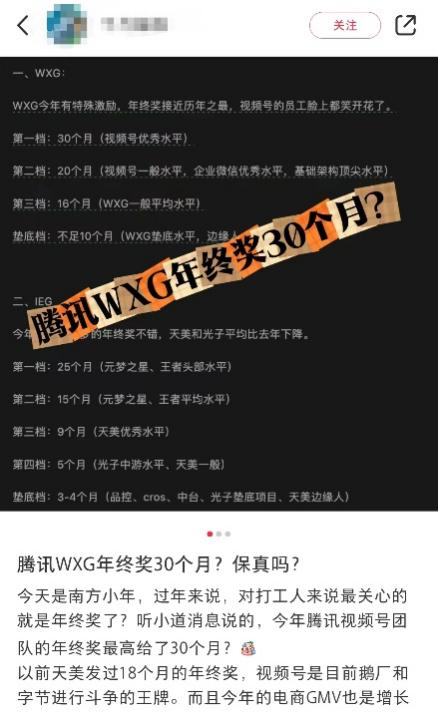 近日,一張騰訊WXG(微信事業羣)年終激勵的截圖在社交平台廣泛流傳。其中顯示,WXG年終獎接近歷年之最,視頻號員工臉上笑開了花,績效第一檔員工能獲得30個月月薪的年終獎。