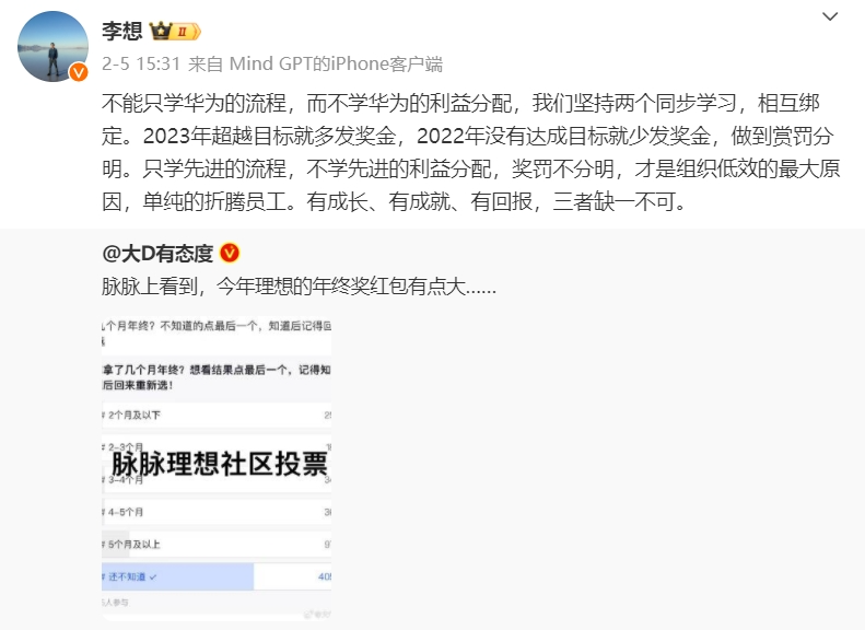 對此,理想汽車CEO李想還在微博上回應,稱“不能只學華為的流程,不學華為的利益分配。2023年超越目標就多發獎金,2022年沒有達成目標就少發獎金。”