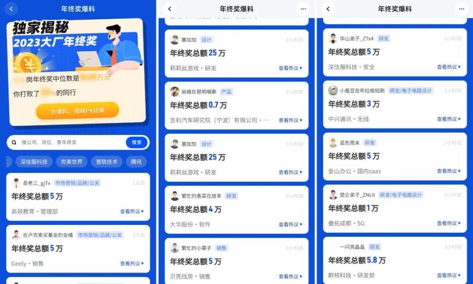 職場社區“脈脈”特別推出了“年終獎爆料”板塊,用户可以主動分享自己所在的公司、崗位以及年終獎情況,供其他網友參考。