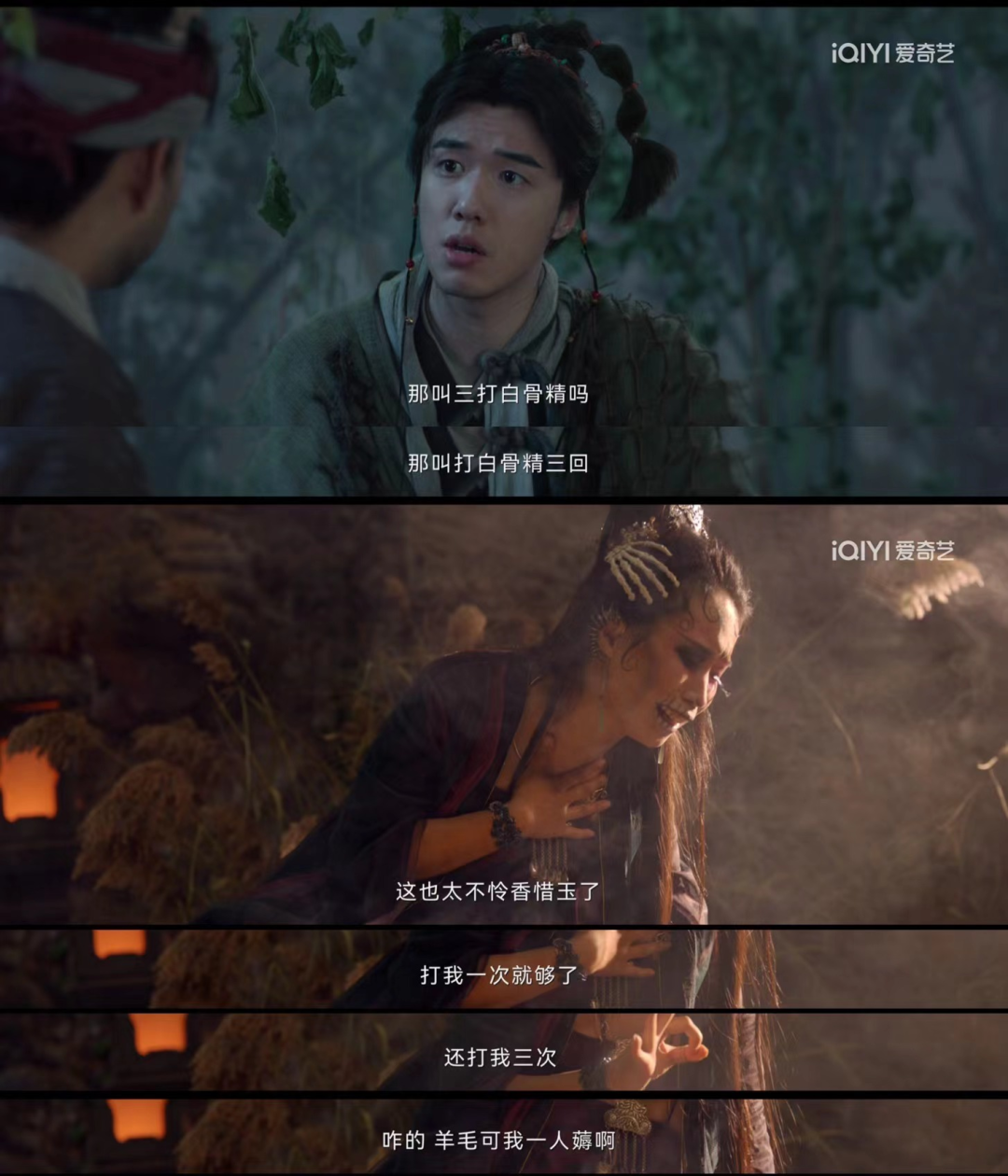 必須承認,**《少爺和我》在做一種很新的“春節檔標配”。**就拿上面這兩個例子來講,它極致戳中了一代人的春節娛樂必備品:精神上的,經典作品的娛樂化再解構,畢竟誰的寒暑假沒有一部《西遊記》呢?物質上的,大過年的親朋好友相聚,“好酒好肉”也是傳統保留項目。