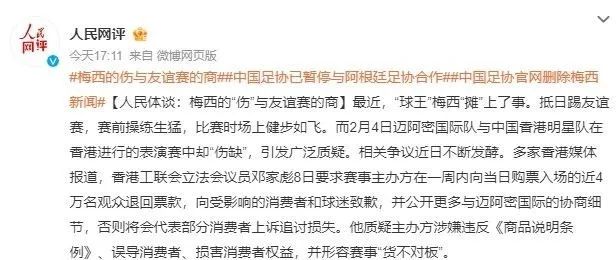 今天,據@人民網評(人民網官微)等多家網媒報道,中國足協已暫停與阿根廷足協合作,中國足協官網也刪除關於梅西的新聞。