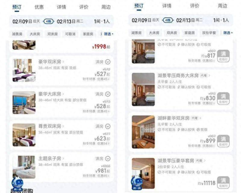 2月7日,現代快報記者採訪發現,許多酒店的客房已經訂滿,特別是家庭房、親子房。無錫一家酒店目前除夕夜的基礎款房型已經全部訂完,“您在美團、攜程這些平台上看到的售罄的房型,就是已經訂滿的。2月8日還有少量空房。”工作人員表示,主題親子房是最受歡迎的,平均下來一晚是900多元,一兩個星期前就預訂完了,有的是一家人來旅遊的,有的是返鄉人羣。目前該酒店豪華雙牀房、豪華大牀房、尊貴雙牀房、主題親子房都已經滿房,得一直等到大年初五,才有空的可以預訂。