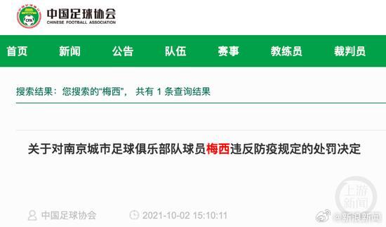 9日,上游新聞記者在中國足協官網搜索相關“梅西”的文章,確實只能搜索到2021年10月一篇關於南京城市足球俱樂部隊球員梅西的處罰決定。