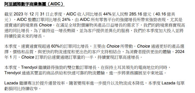 財報還提到,由於物流效率的提高,速賣通每單虧損正在收窄。