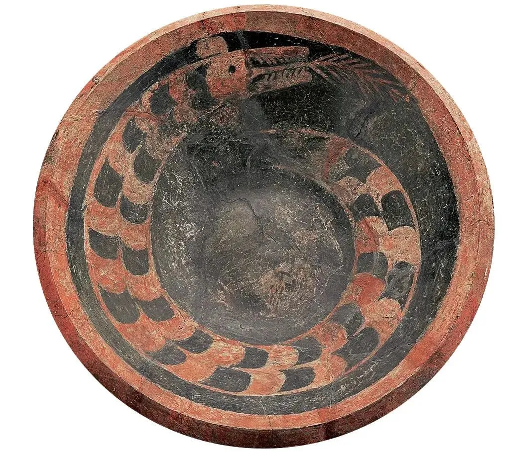 山西襄汾陶寺遺址一個大墓中,出土了一個蟠龍紋陶盤。黑色陶盤裏,盤着一條硃紅色的龍。看起來像蛇,卻長了一嘴的牙。這被認為是中原地區最早的蟠龍圖案。龍又出現在新石器時代了。