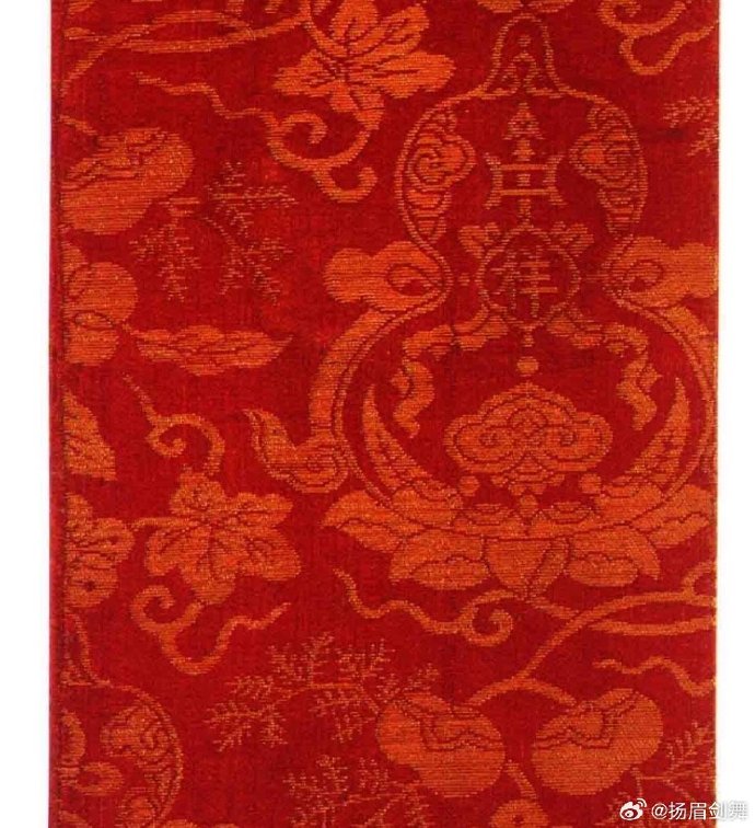宋代審美整體逐漸婉約優雅自然,花型以各種纏枝花卉題材為多,在春晚《年錦》@李沁 的服飾中,我們首選了一款2022年首次展出的南宋“牡丹月桂紋羅”,因為這款花型花葉中有花,元素豐富,可作為南宋紋樣代表。