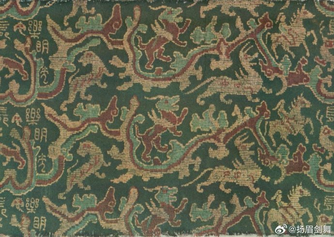 漢代紋樣充滿了自然爛漫靈動的雲氣、山巒,以及奔舞其間的鳥雀瑞獸,這次春晚《年錦》劉濤所着的服裝領口,我們選擇了一款出自樓蘭的長樂明光雲山瑞獸錦,同款在許多博物館中也有收藏,是漢代常用的吉語織錦。鏡頭特寫中展現的刺繡則是著名的信期繡,以玄鳥象徵信期而至,此件刺繡也是國家博物館古代服飾文化展中的復原品。