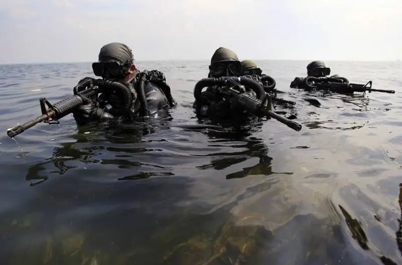 當然,執行此類作戰任務都需要海豹突擊隊員具備良好的水性,因此,在海豹突擊隊訓練這一方面,跟水有關的訓練是每一名海豹突擊隊員的必須考核科目,比如在海豹突擊隊內部,有一項訓練科目就是需要受訓者將雙手綁住沉入水底,再通過牙咬的方式將水底的面罩帶出來到水面,光是這一訓練項估計就能勸退很多想加入海豹部隊的士兵。
