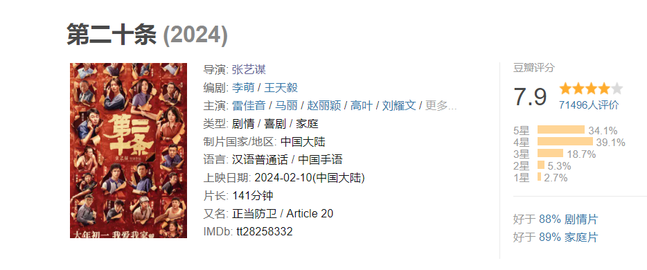 如今,大概是豆瓣新用户都是00後為主了,豆瓣氣質也完全不一樣了。如今國產片基本上在豆瓣也都是7.5分起步,8分不算高了。都有點讓我不習慣了。《熱辣滾燙》和《飛馳人生2》,還有《第二十條》都有差不多8分,這要放在5年前10年前…….一年你基本都找不到1部評分超過8分的國產片啊。