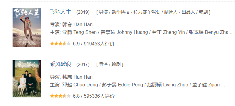 韓寒電影之路《後會無期》起步以後,從《乘風破浪》到《飛馳人生》,一步一個台階,口碑、票房都很成功。