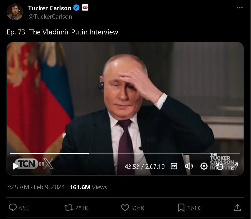 因此,在這段採訪的完整視頻於北京時間2024年2月9日除夕這天早上7時25分被卡爾森發佈在馬斯克執掌的社交平台X上後,美國很多媒體——乃至西方的媒體,尤其是主流媒體,都破防了。