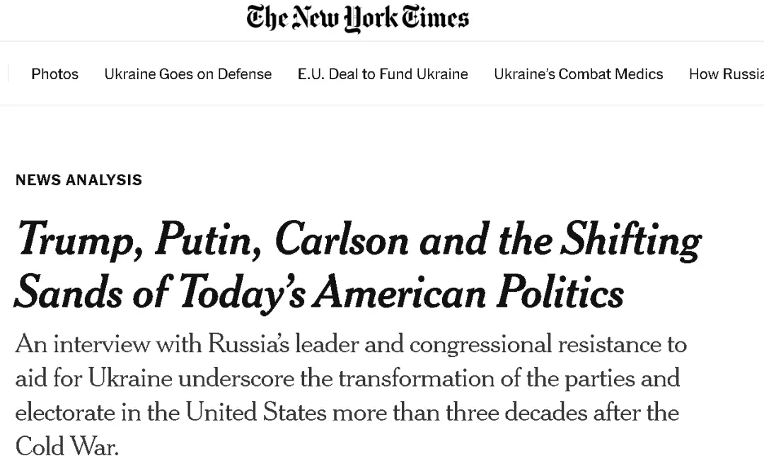 而第二類的破防,則是像《紐約時報》下圖中另一篇“新聞分析”那樣,在哀嘆美國政治的墮落,尤其是痛斥卡爾森所來自的美國右翼勢力“今不如昔”,為了迎合民粹政治就給普京發聲的機會和平台,給他做宣傳,以至於普京現在在美國受歡迎程度,比2022年俄烏衝突剛爆發時還要高了。