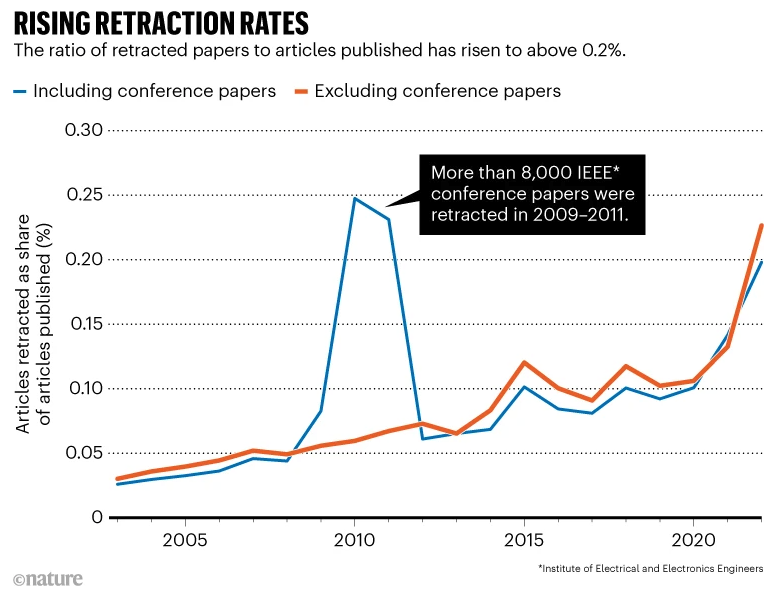 撤稿率,指在任何給定年份發表的論文中後續被撤稿的比例,這一比例在過去十年中增加了兩倍多。2022年撤稿率超過了0.2%。在過去二十年裏,發表超過10萬篇論文的國家中,沙特阿拉伯的撤稿率最高,為每10000篇論文撤稿30篇,不包括會議論文。如果包括會議論文,由於中國之前從IEEE大量撤稿,這將導致中國的撤稿率超越沙特。