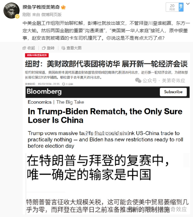會不會有些勢力,不樂於看到中美金融關係緩和,國內情況好轉的,想要要痛下殺手,破壞會談,甚至殺雞儆猴,讓其他促成中美和解的人和勢力,不敢妄動?