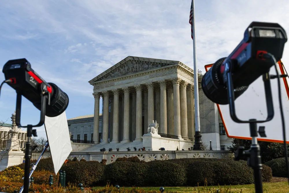2月8日,媒體拍攝採訪設備架設在美國首都華盛頓的美國聯邦最高法院外。新華社發(亞倫攝)
