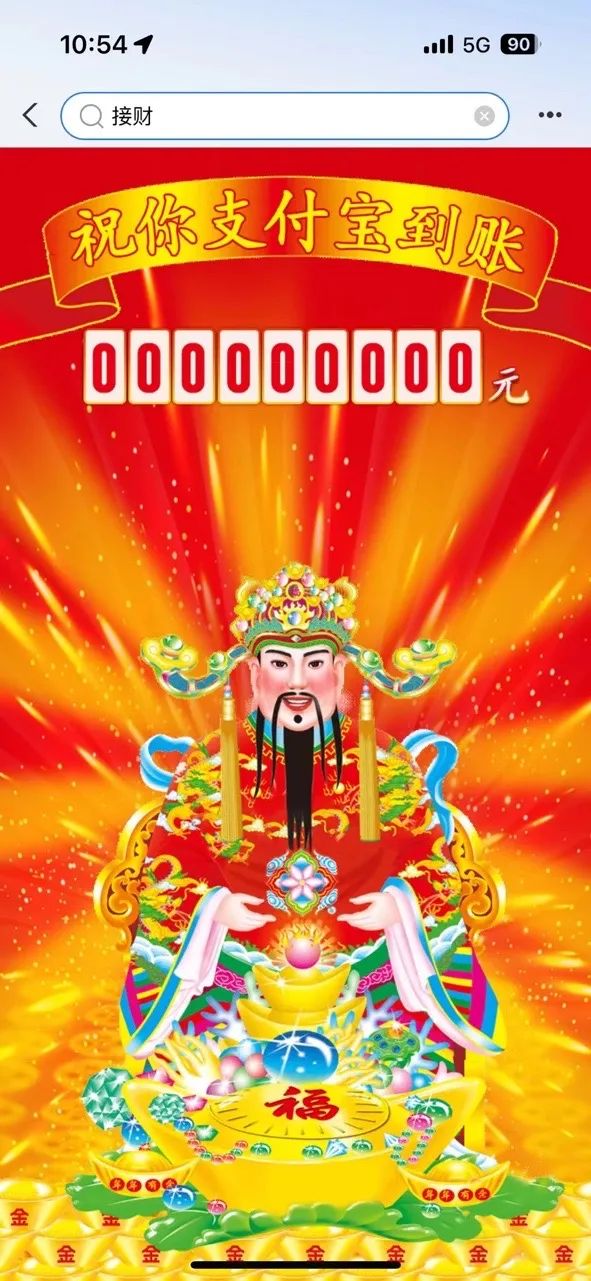 在支付寶裏搜索“接財”,一尊金光閃閃自帶BGM的炫酷財神爺,就會立馬浮現出來,把財運接到餘額裏,主打精準接財。