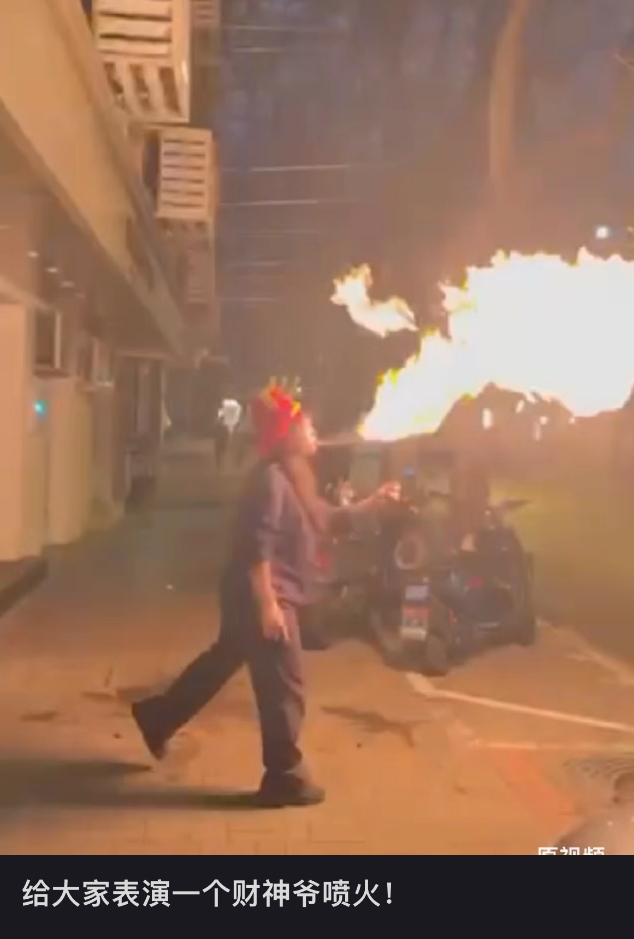也有人cosplay財神爺在酒吧門口噴火,寓意“火火火”;