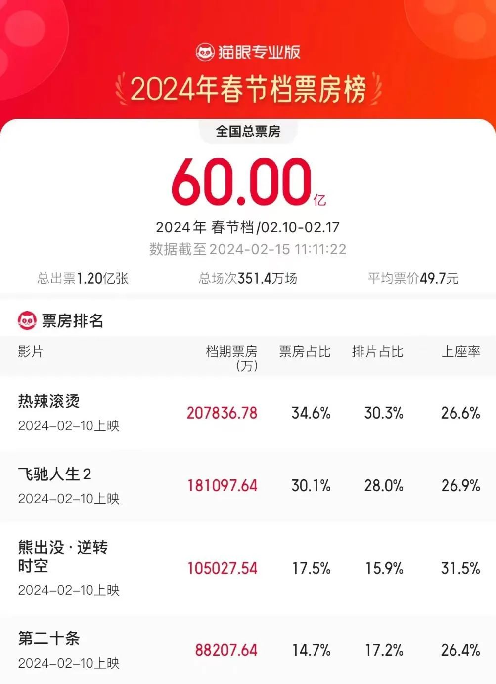 ▲據統計數據,截至2月15日11時11分,2024年春節檔(2月10日—2月17日)檔期總票房(含預售)突破60億,《熱辣滾燙》《飛馳人生2》《熊出沒·逆轉時空》暫列檔期票房前三位。
