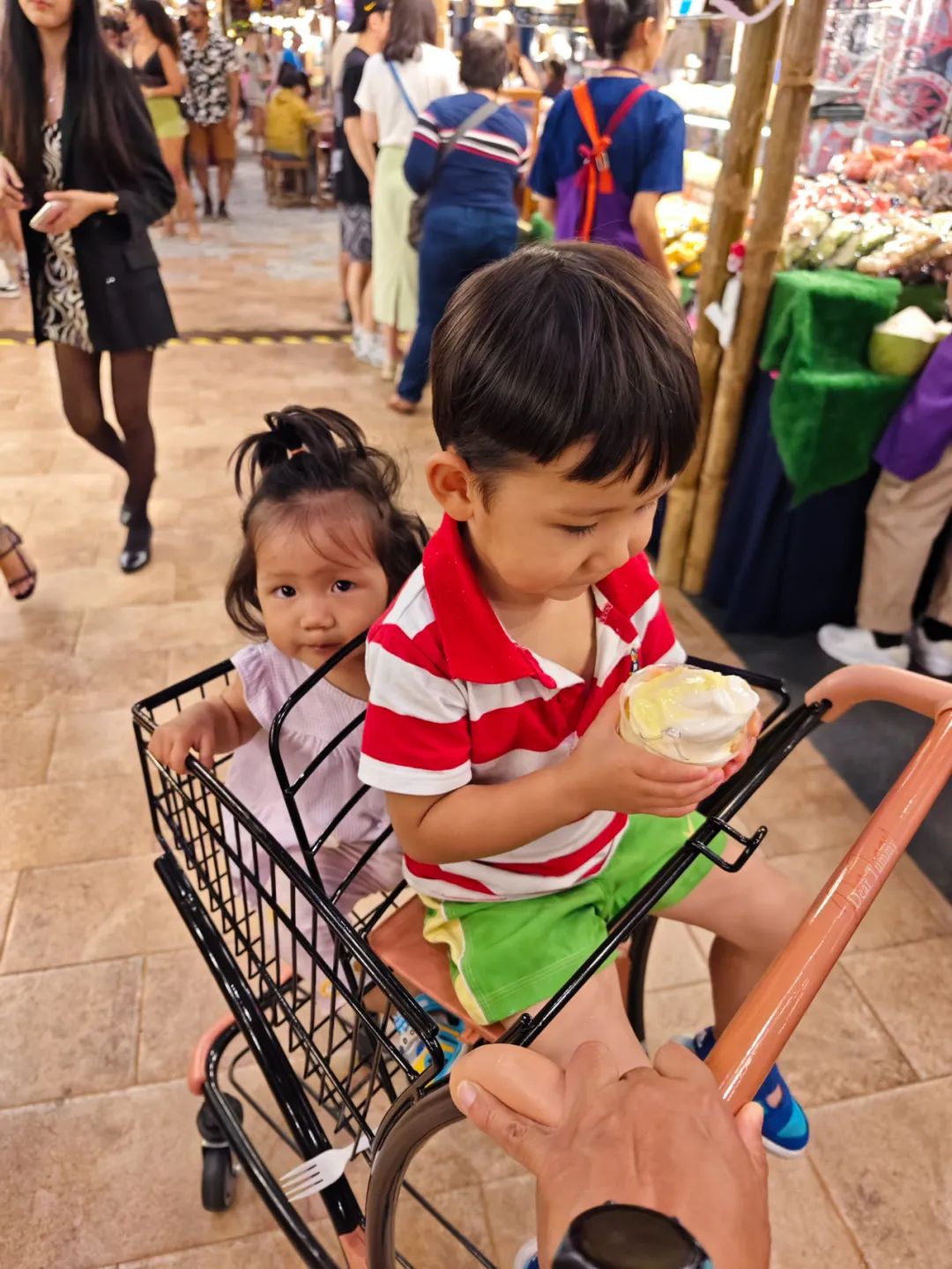 泰國對饅頭而言那當真是老鼠掉進了米缸裏,“此間樂,不思滬”——可以盡情玩水、挖沙子,可以隨時吃冰淇淋……每天都嚷嚷着不要回家不要去上學,甚至連他最愛的奶奶都不要了,而他的快樂自然都建立在我的“痛苦”之上。户外圈子有句話專門形容風景很好但很艱苦的線路,叫做**“眼睛上天堂,身體下地獄”;我對泰國之行的總結則是一句話——“兒子上天堂,老子下地獄”**。不但要當保姆,出門還要給饅頭做牛馬,扛着他走街串巷。有人可能會説:你不能這樣慣着小孩兒,要讓他自己走啊!各位有所不知的是,讓他自己走的話我更累,得要目不轉睛地盯着他、提心吊膽地拽着他、大步流星地追着他、時時刻刻地催着他……比起這樣的心累,我寧可身體累一點,就當作是鍛鍊身體了。