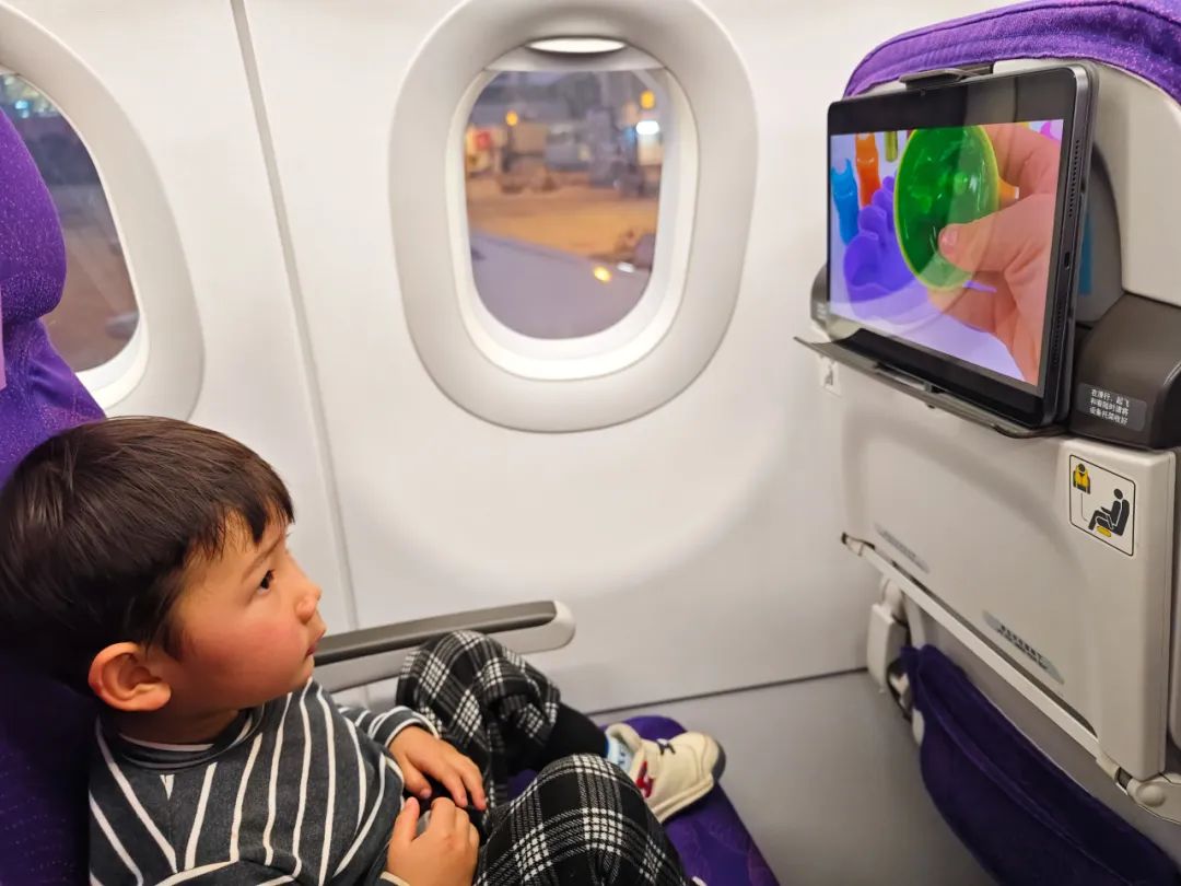 饅頭上一次坐飛機是從印度轉機法蘭克福回國,那時他才剛滿一週歲,還不怎麼會搞事情,除了一直要抱着累了一點,別的都還好。如今的饅頭比那時多吃了兩年的飯,早已不會再任你擺佈,坐飛機也已經有了自己的座位——要如何讓他在一個位子上坐四五個小時不離開,是我特別犯愁的一件事。為了這次臨時決定的舉家出行,我火速購入了一部平板電腦——平時在家裏我們並不讓他使用電子屏幕產品,平板電腦僅供他在旅行途中看動畫片用——後來證明這是一個無比英明的決定,哪怕饅頭能夠安靜專注個十幾二十分鐘,對我來説都是莫大的解脱。
