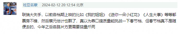 輿情官認為,《小紅花》當年選在元旦前上映就是很不錯的時間段,或者,放在清明節或者520上檔也相當有競爭力。無奈龍年的情人節檔和春節檔重疊,白白浪費了這麼好的時間段。