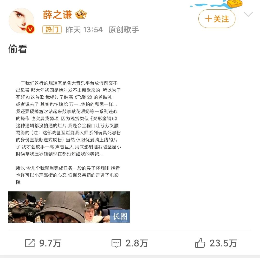 薛之謙分享《飛馳人生2》被指盜攝,發打油詩回應:本尊在謝,你在塞臉_風聞