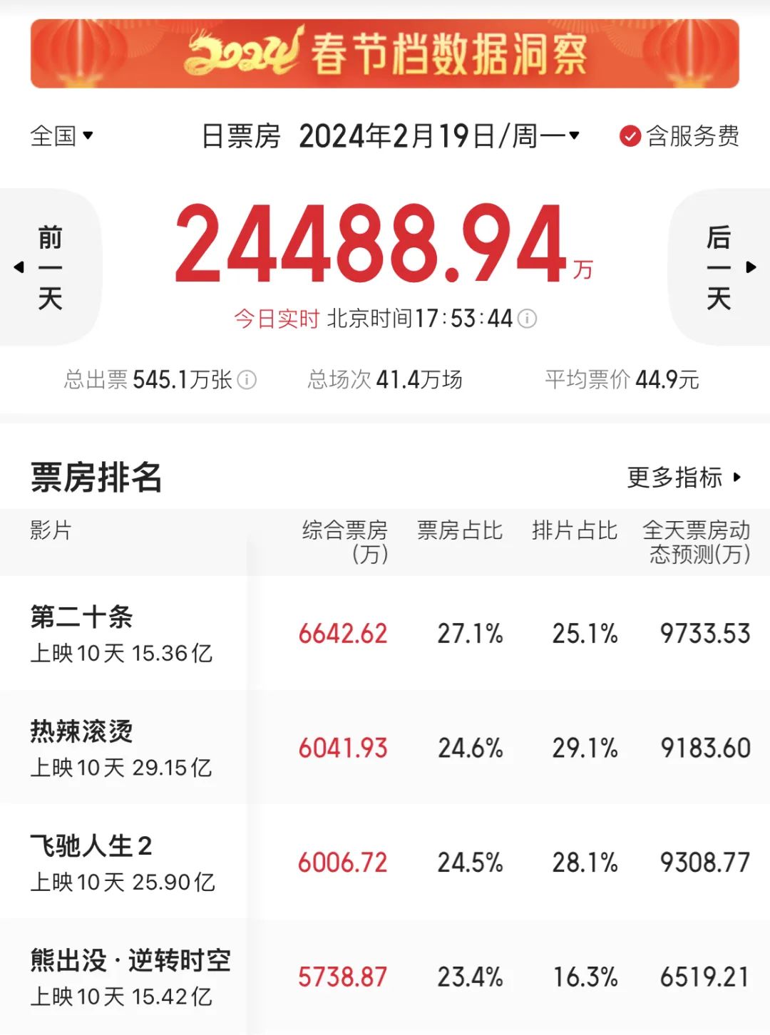 這一點,已經開始初露端倪。自昨天(正月初九)始,票房始終稍遜一籌的《第二十條》開始發力,日票房首次超越《飛馳人生2》,到了今天,更是以稍遜一籌的排片,力壓《熱辣滾燙》和《飛馳人生2》,邁入票房日冠的行列。